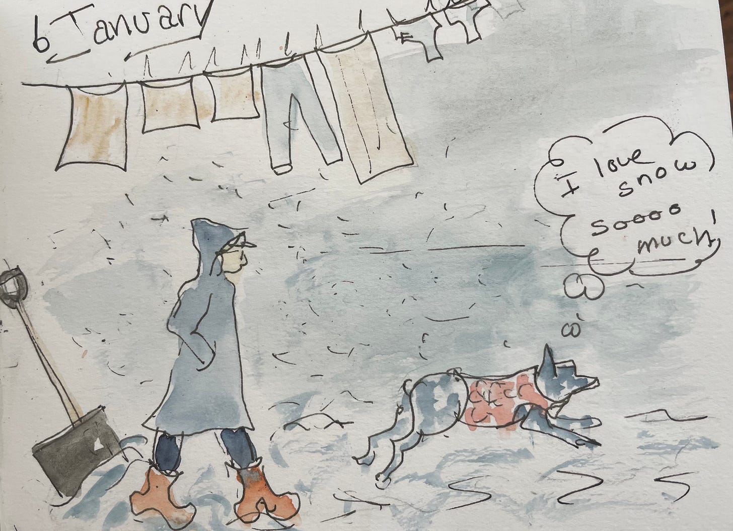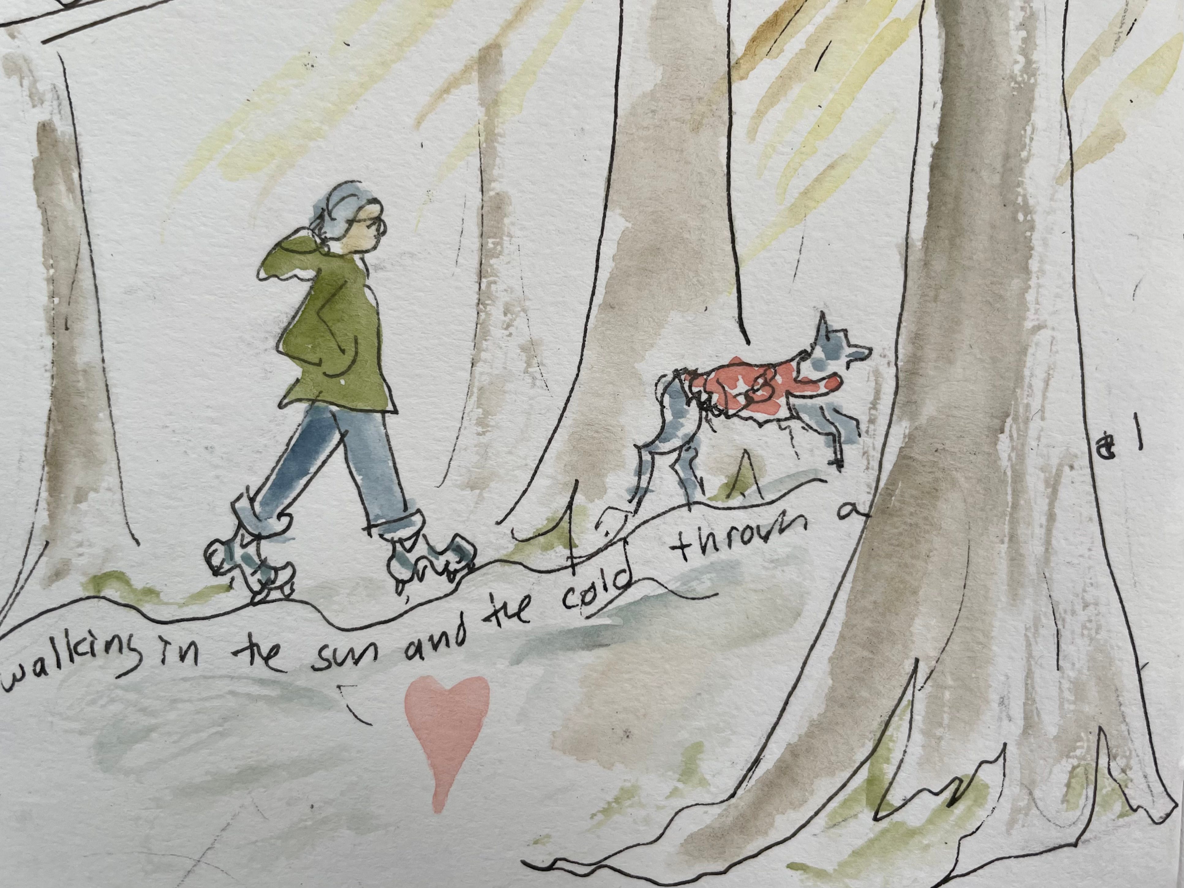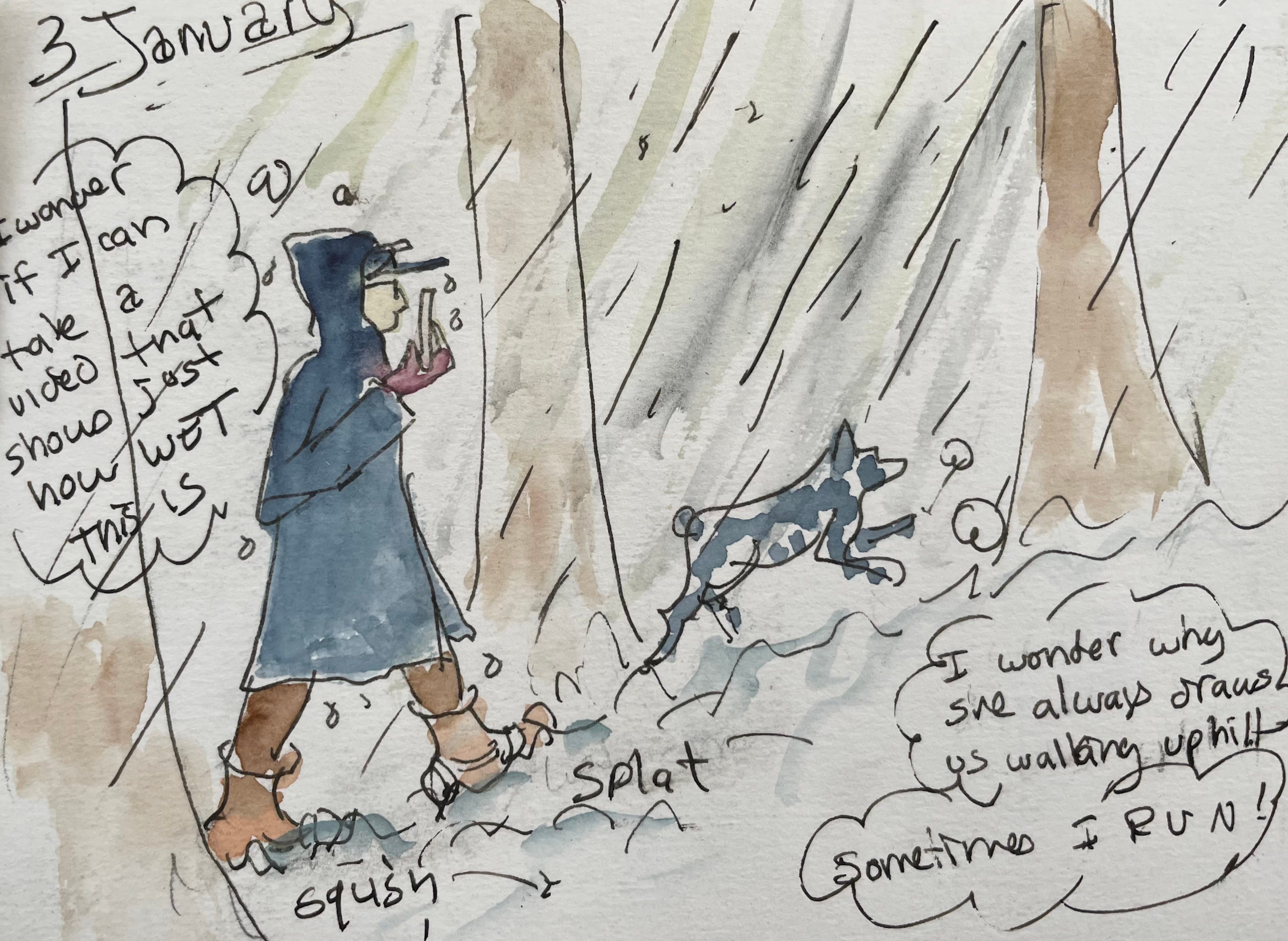 I didn’t include the video I took on the rainy, squishy-snow walk depicted here. Partly because—rainy and squishy and the fluffy snow is more romantic. And partly because it turns out that if you hold a phone up under your hat in an attempt to keep it dry all you can hear in the video (besides drips and splooshy footsteps) is breathing. I found it annoying to listen to and figured you would too.