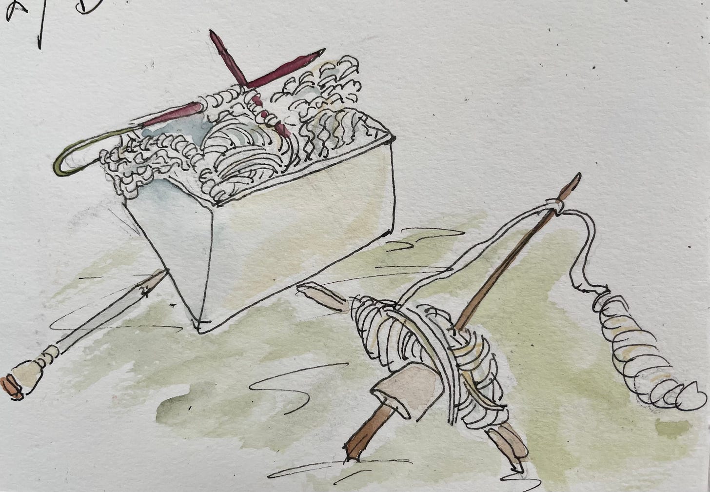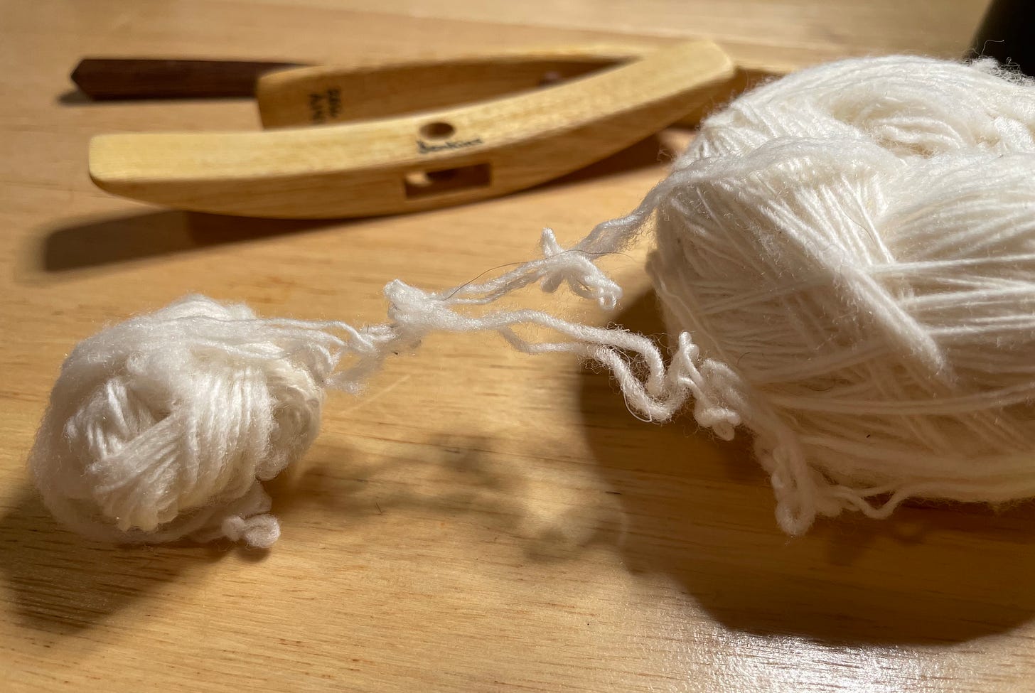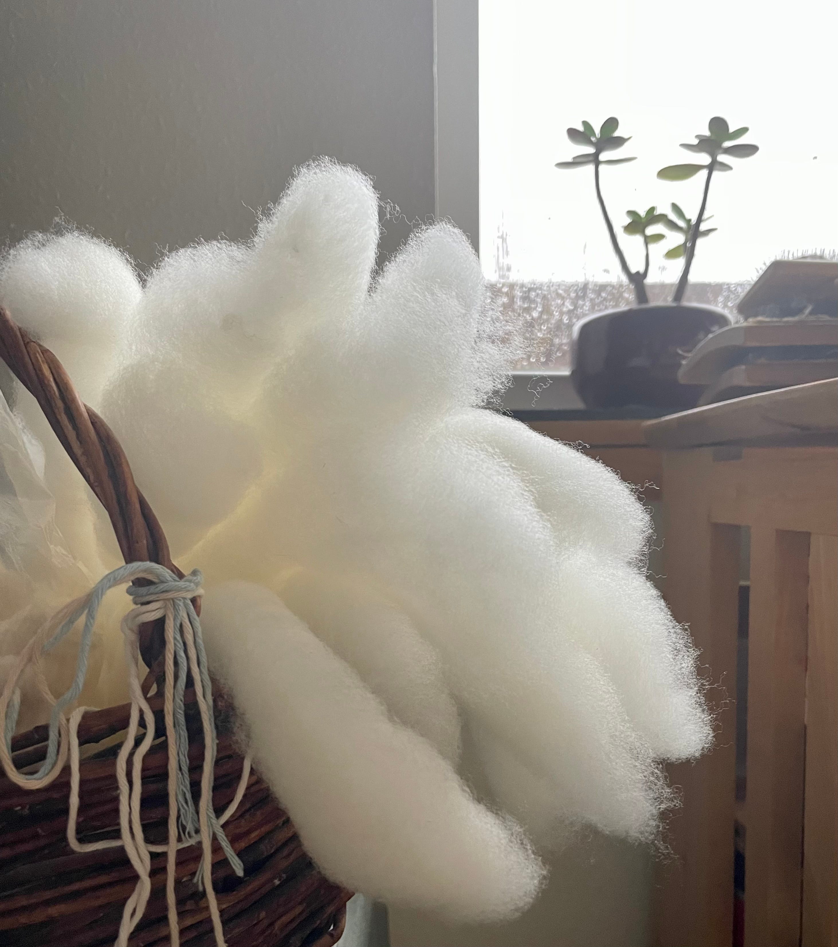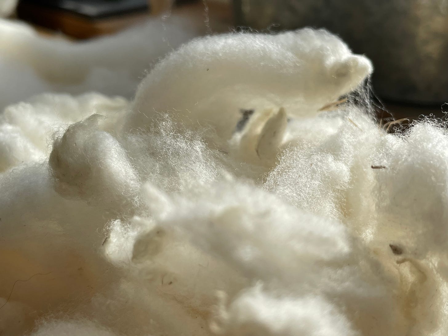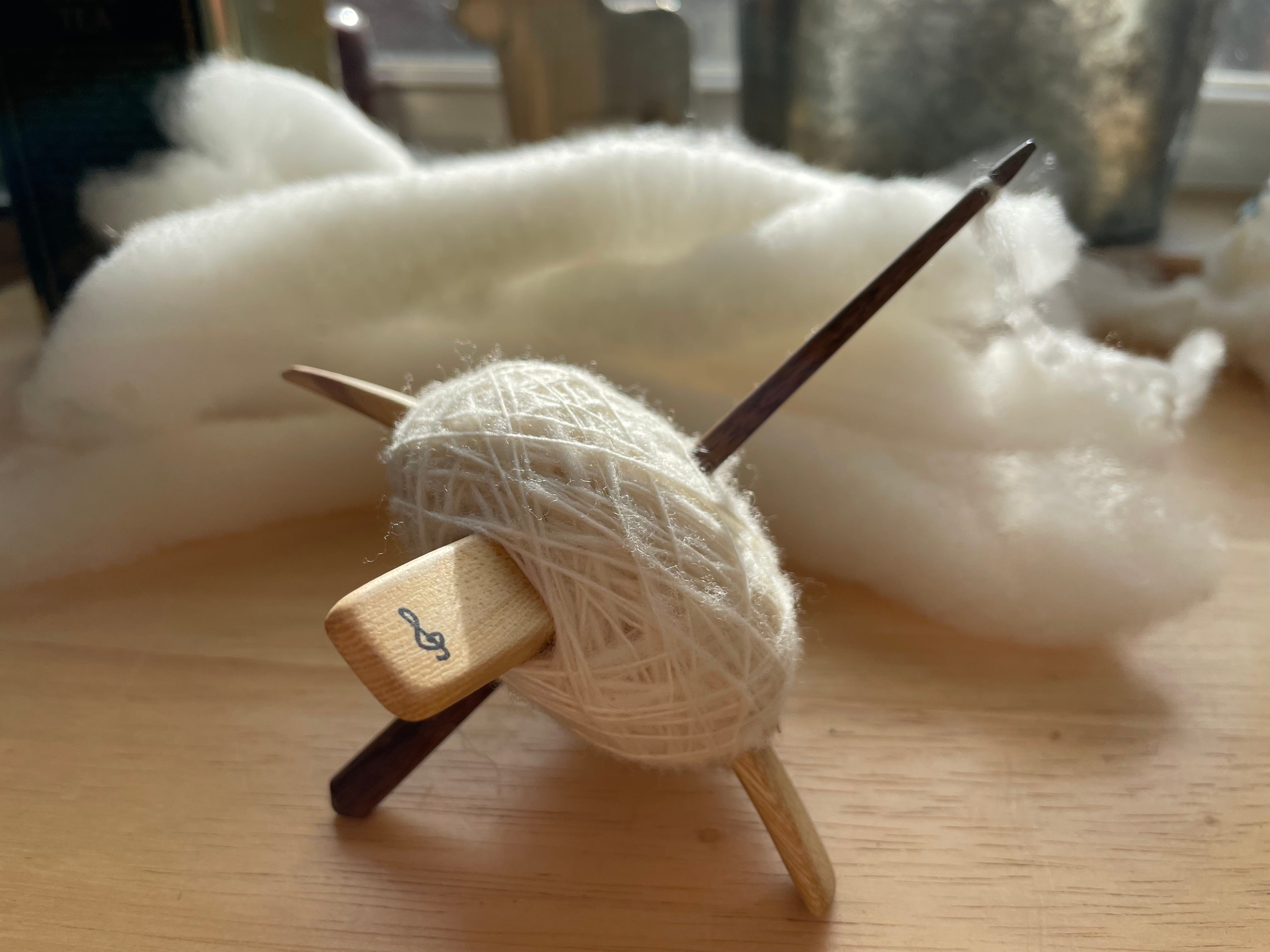 I’m going for a “fingers in all the pies at once” approach for this, my first project with this fleece. As I said in the last footnote, I’m washing it an ounce at a time (separating it into locks before washing to avoid any clumping and for maximum cleanliness). Flicking the ends of each lock helps with any long term storage issues, then I hand card as hands and spindle desire. Because I’m using a cross arm it’s easy to wind the inside and outside of each cop together twice to make four strands which I then ply into a super fat fluffy and airy knitting yarn—exacerbating any anomalies, though so far the sweater I’m making has been happy to absorb them. We’ll see when it’s done if I can tell where I switched skeins.