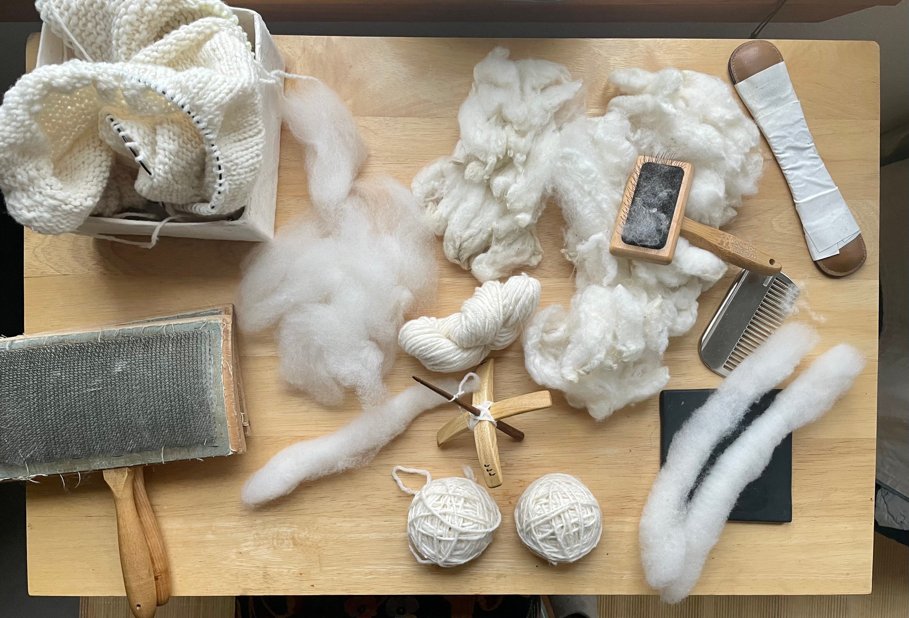 What’s particularly fun is that I get to relish each step and am never overwhelmed by any one of them. And since all the tools are small, it’s easy to keep them handy. All this in contrast to what I first learned (and mostly continue) to do: wash the whole fleece, tease and card a pound or two (usually drum card), spin singles till that fiber is gone, mix them up/randomize the balls of singles to even out any anomalies, then ply, dye (if desired), and finally knit. Or weave.