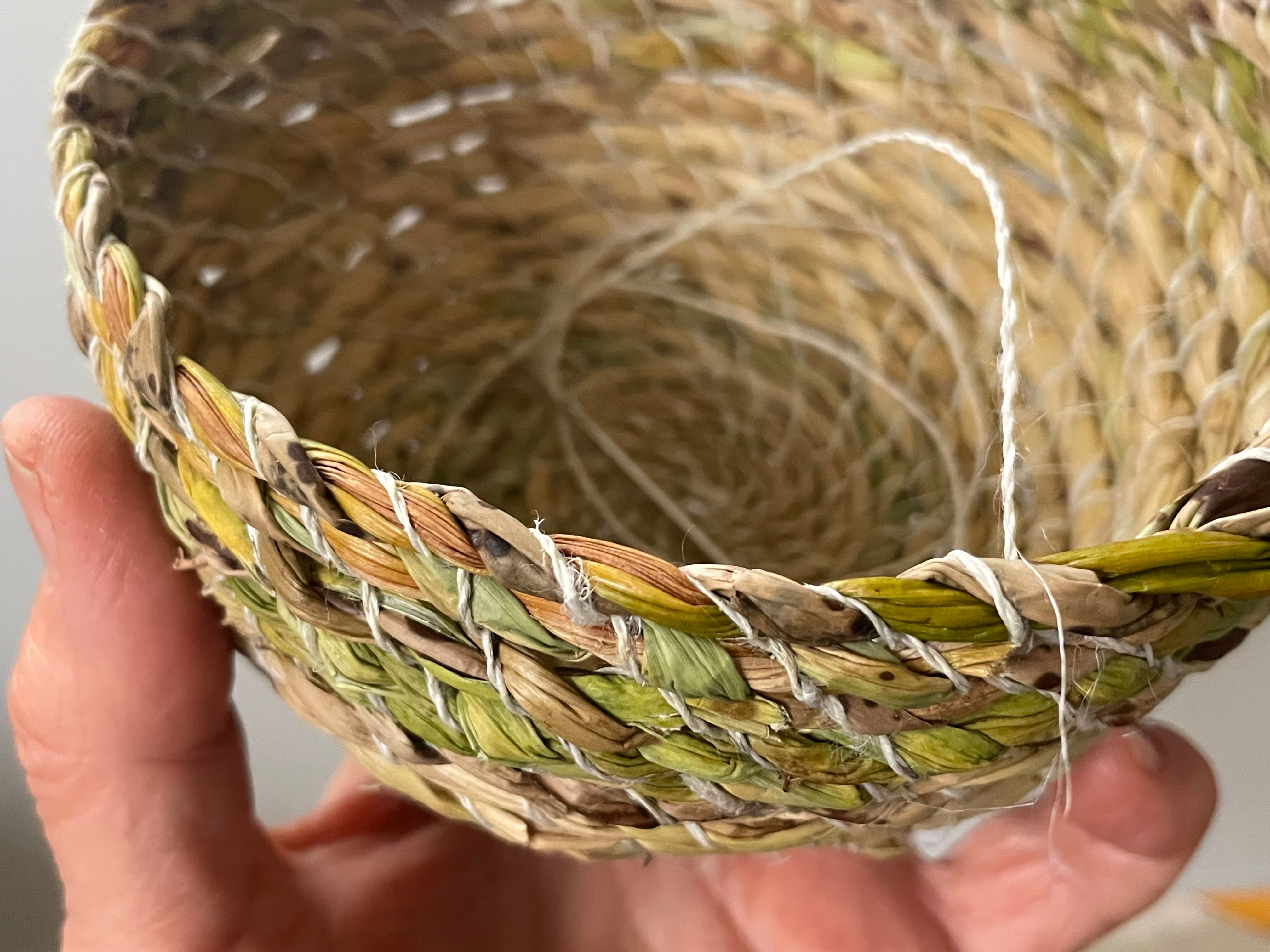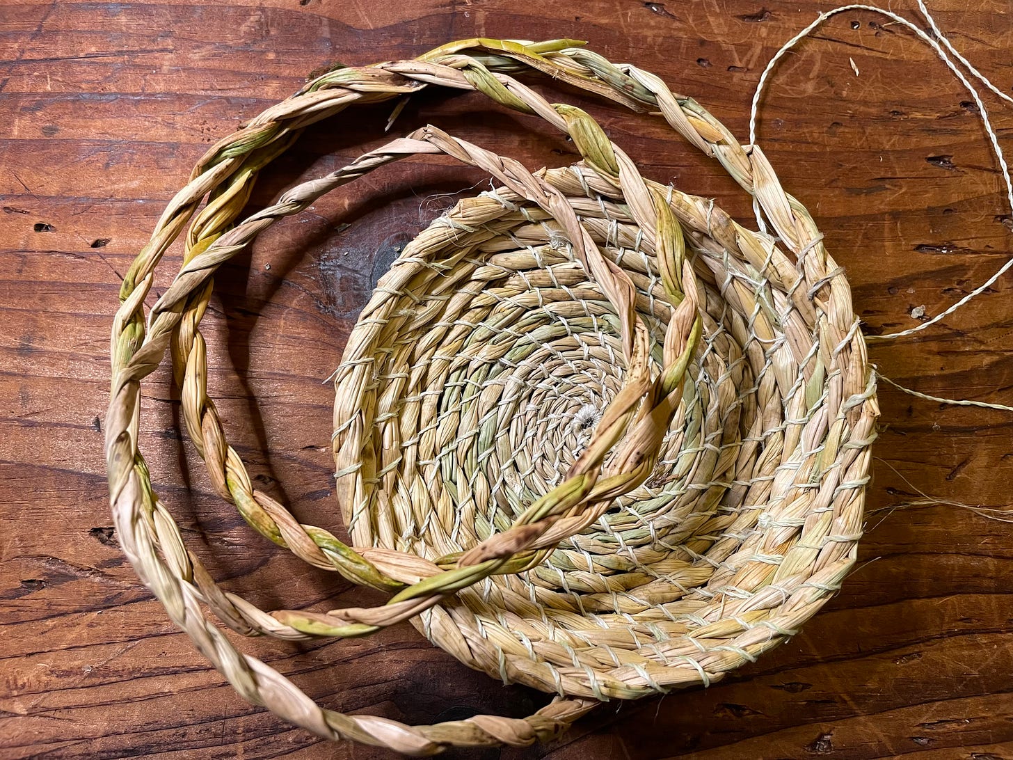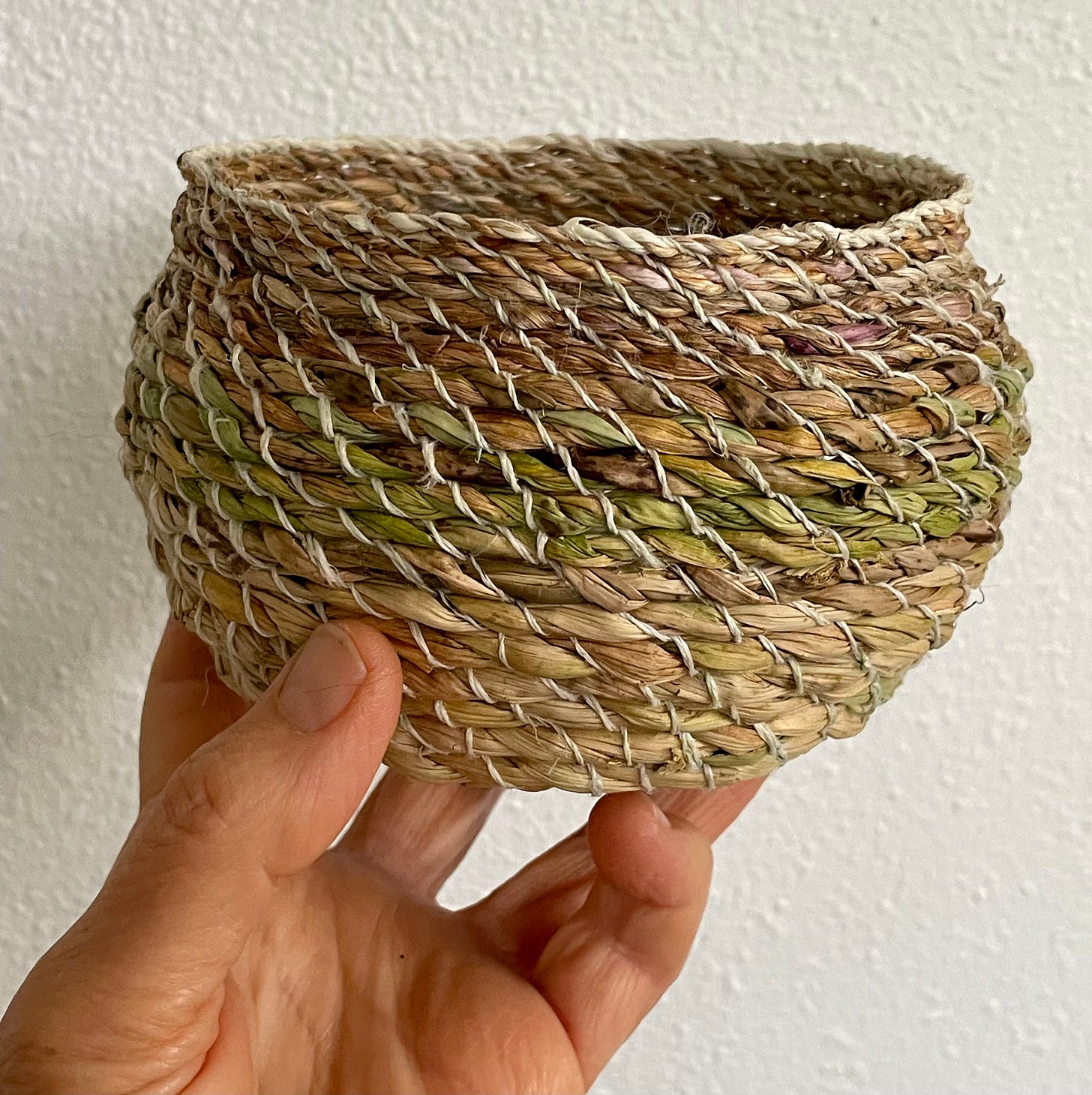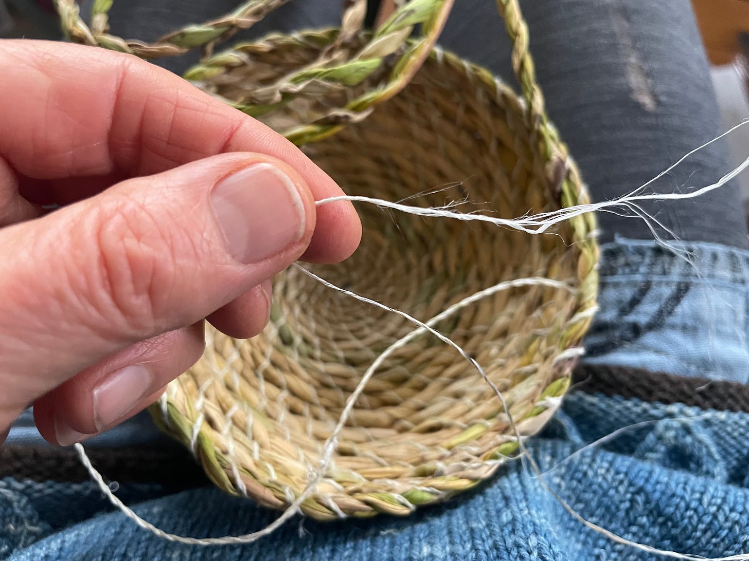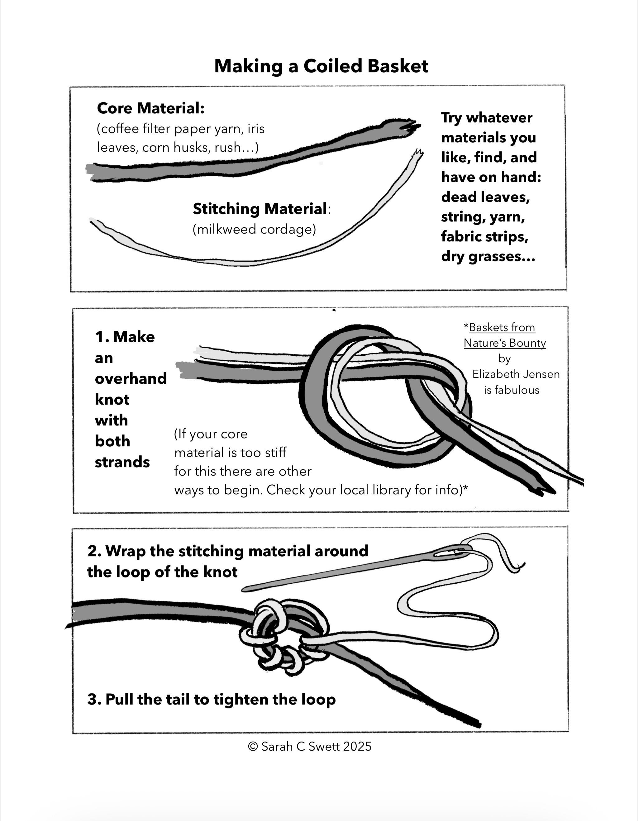 I would remind you that I am still learning myself, and that this wee document covers only one way to begin and stitch the coils, but I trust you can find the basketry section of your local library, bookstore or YouTube and expand your own experiments from there. My very favorite book on the subject is called Baskets from Nature’s Bounty by Elizabeth Jensen. I’ve had it since it first came out, and have used her tables on gathering materials for myriad other projects. Of course there other resources but this is the one I know best.
