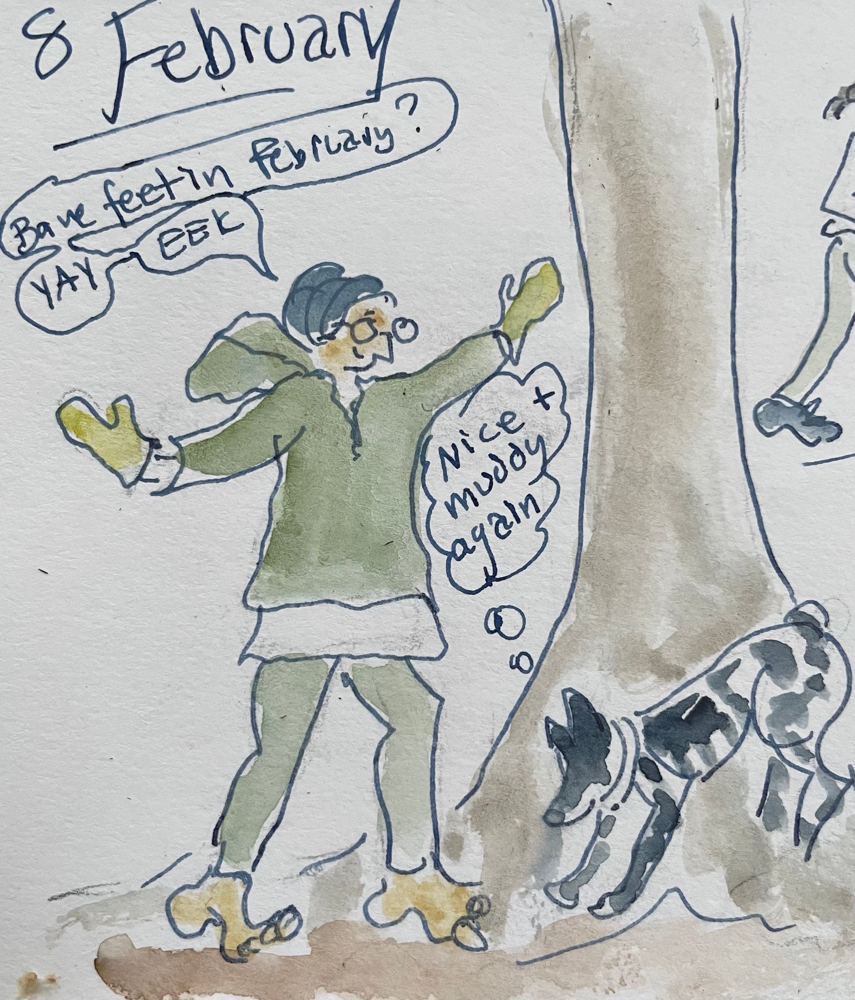 I’d rather be walking in snow this time of year as next summer we will very much need the high mountain moisture and this early warmth is decidedly worrying. But given that there is bare ground, there is no need to forgo the pleasure of cool damp duff (sometimes frozen), beneath my toes.