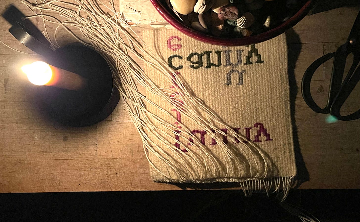 By hand or not—I do not know. The light I use is a Viltrox L116T which comes with both a plug-in option and rechargeable batteries—wonderful if you want to weave in the middle of a room. And though not as satisfying as re-meltable candle stubs, these batteries do seem better than the use-and-discard alternative. What I love most about this light is that I can adjust both warmth and brightness depending on the situation at hand.