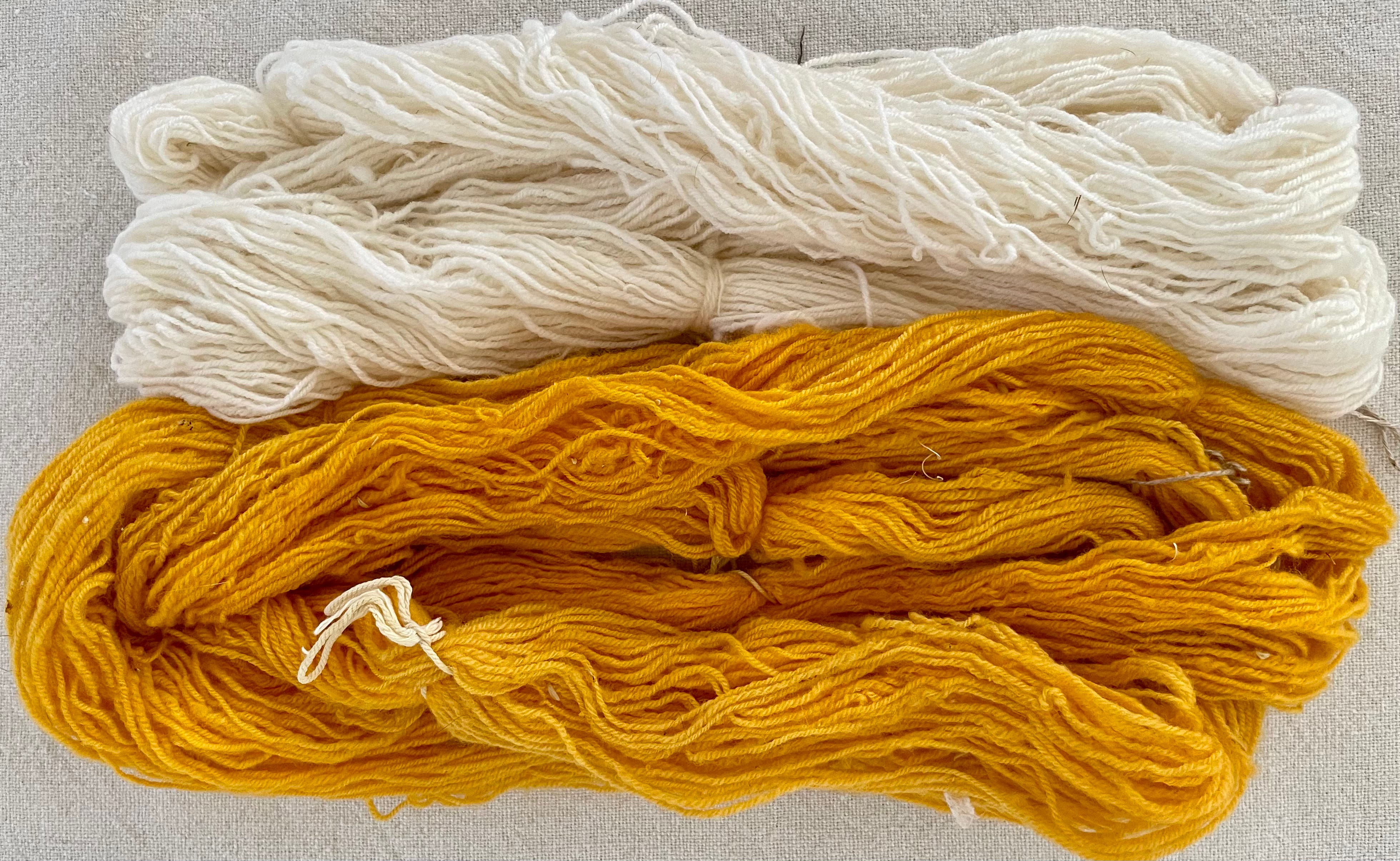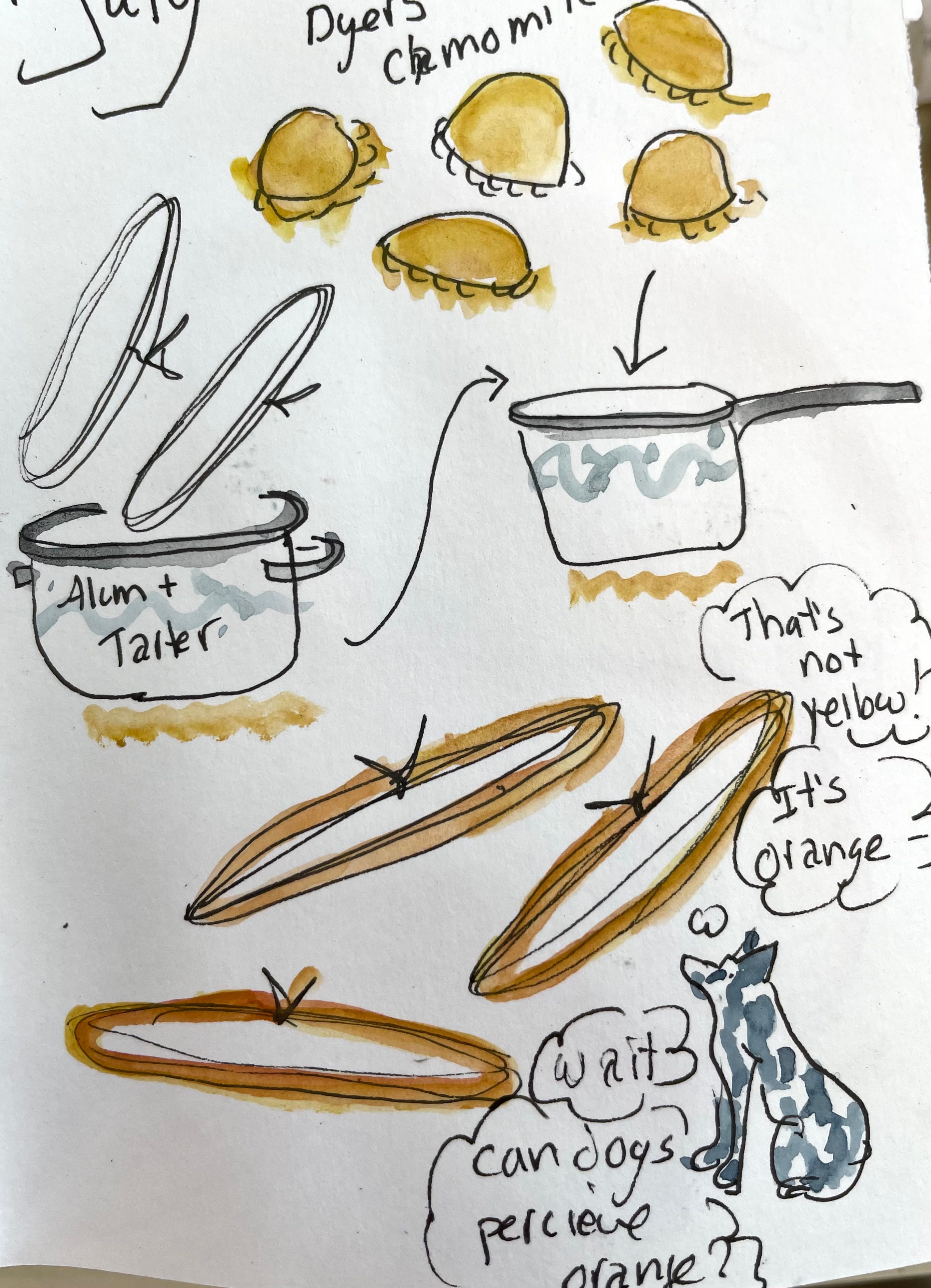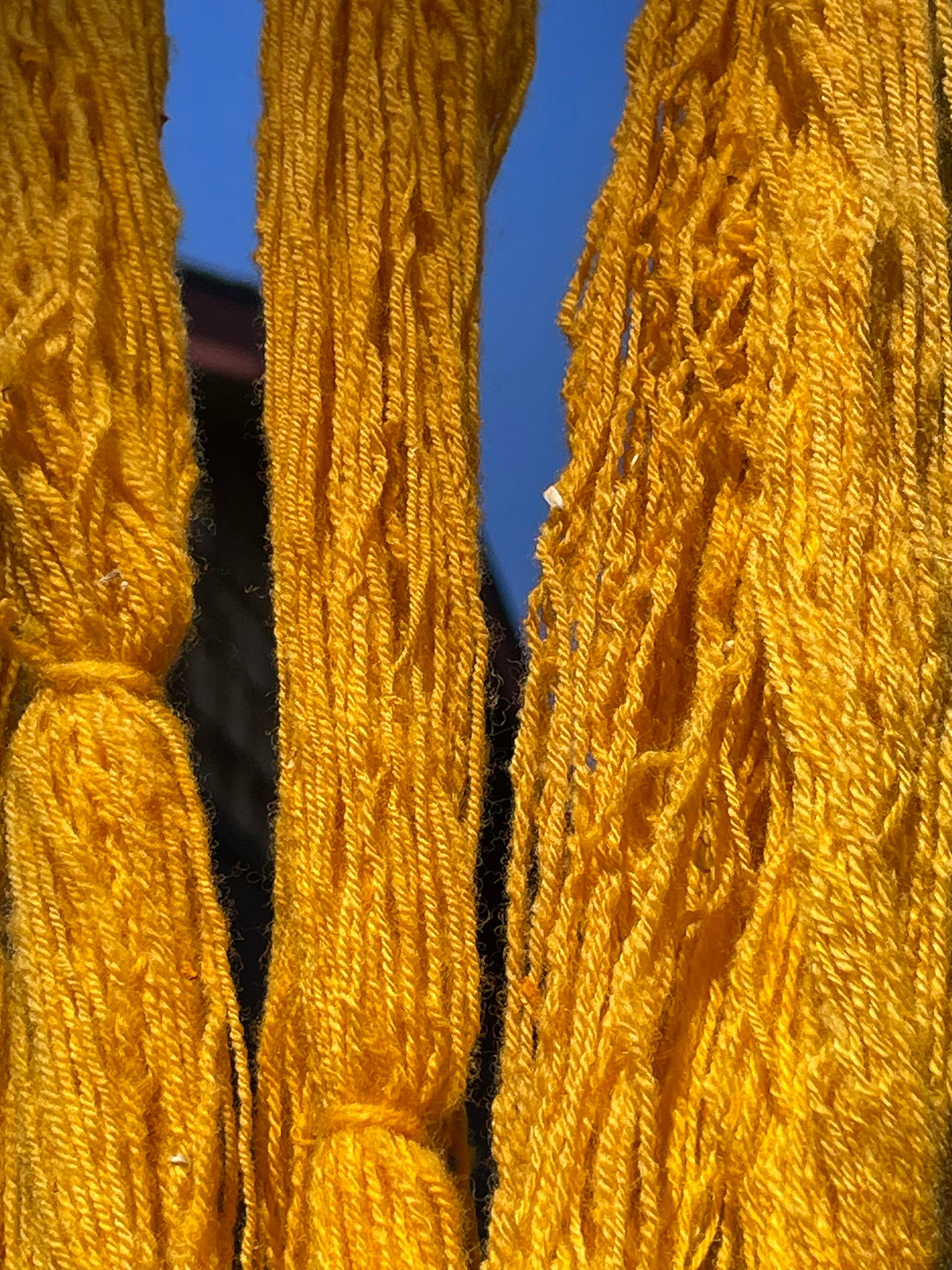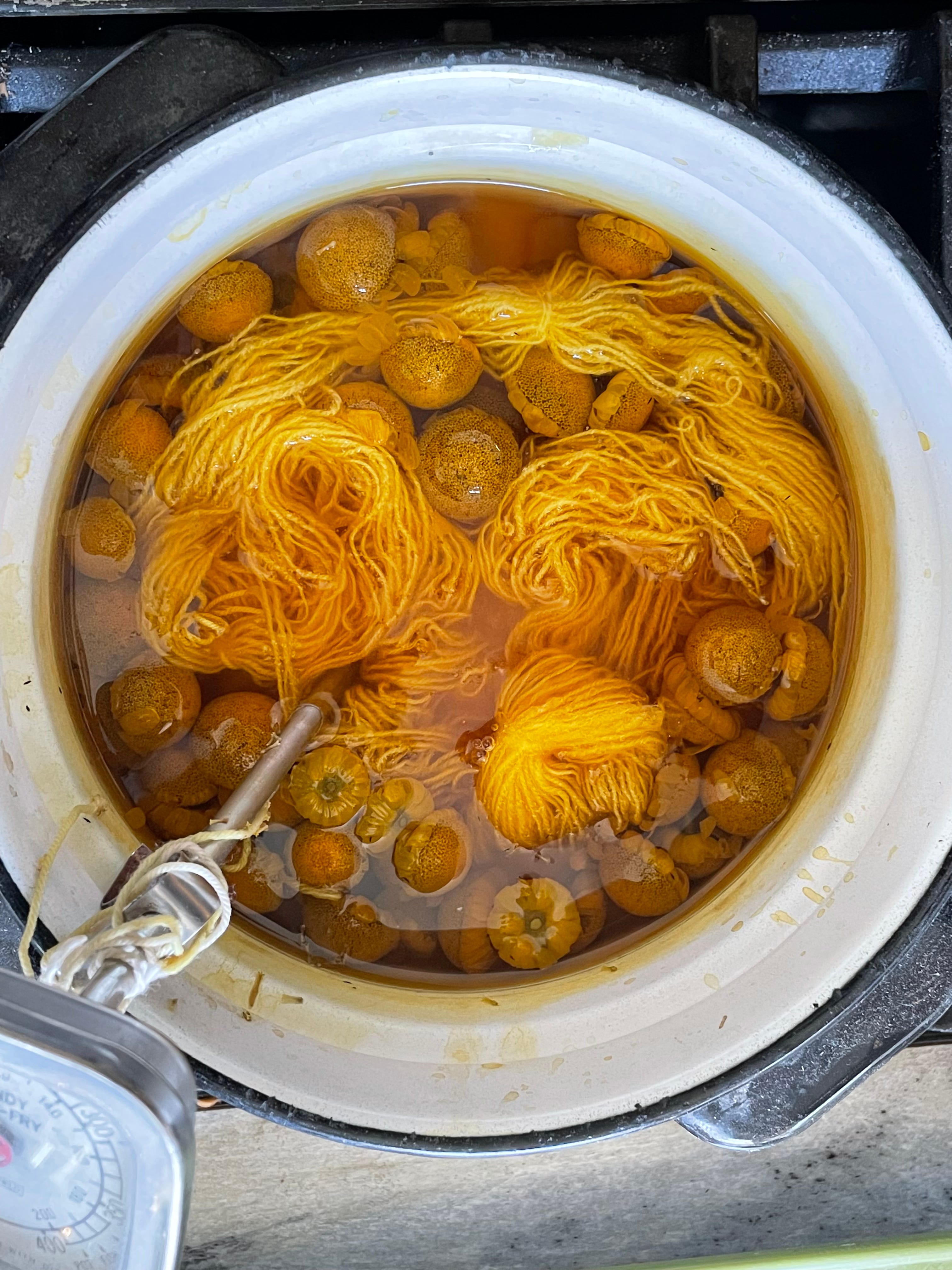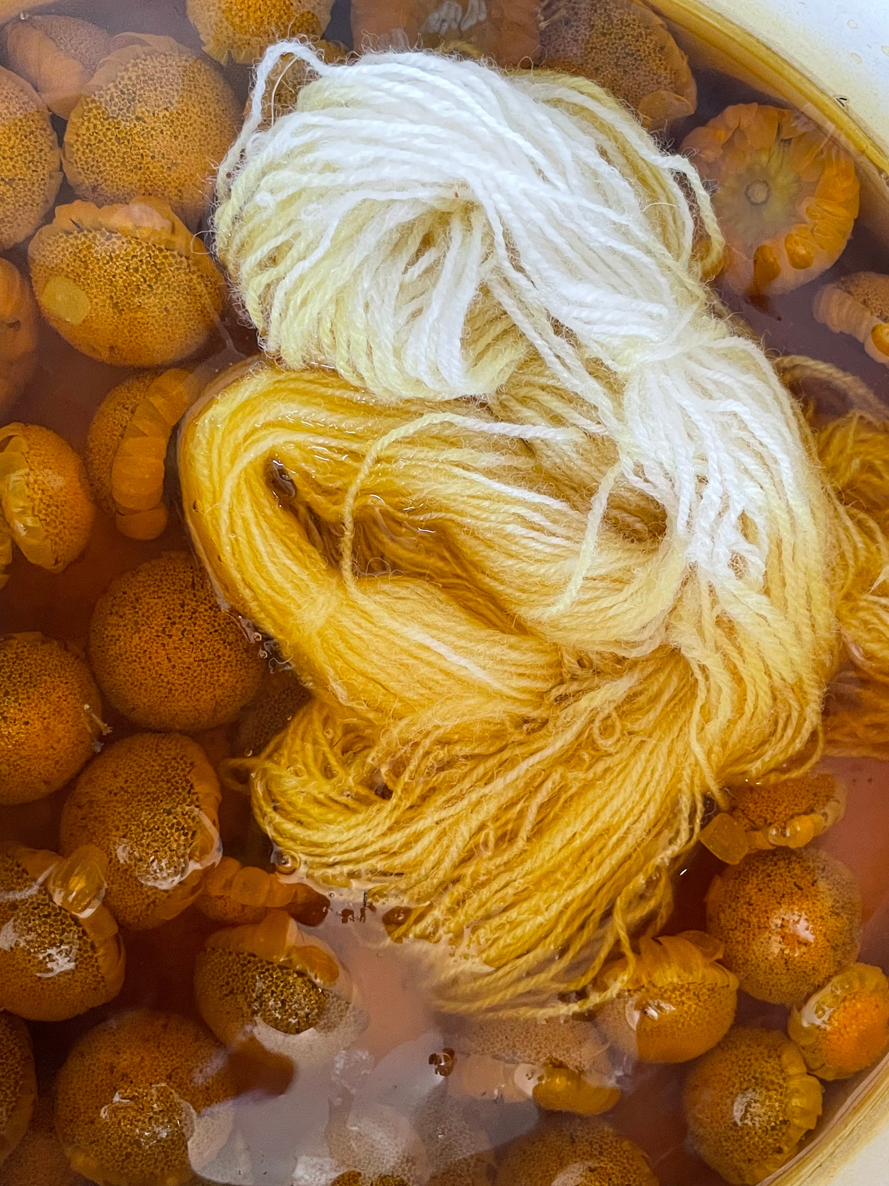 Other things? I added some baking soda to the dye bath for no reason other than that knowing a weld dyebath brightens considerably when slightly alkaline, I wondered if Dyer’s Chamomile would have the same response. It seemed to made a difference, but casual dyer that I now apparently am, I didn’t do the proper experiment and leave half baking soda free—socannot know know for sure.