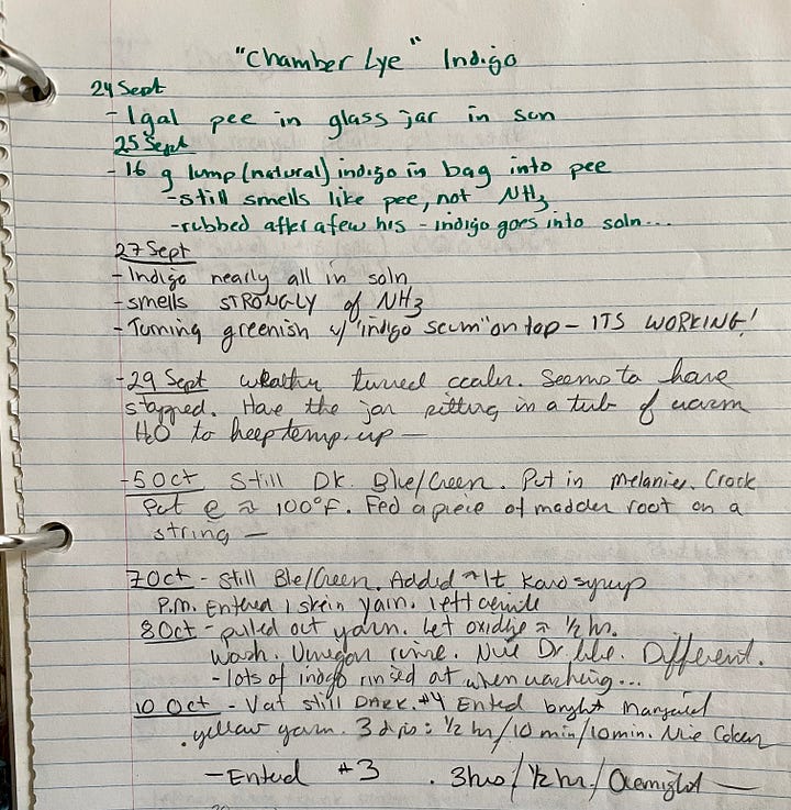An inconvenient bathroom remodel (no toilet for a time), made it easy to collect pee in a bucket for Chamber Lye Indigo, and though this technique never became central to my yarn-dyeing life, the few vats I tried produced some of the richest and most lustrous blues I’ve ever had the pleasure of working with. The yarn was incredibly silky too—with no lingering odor. Can’t say the same for the dyepot in process though. I wrote an article about it called “The Boiling Pisspot of Science” for the Turkey Red Journal; a nod to Bill Nye the Science Guy for the title
