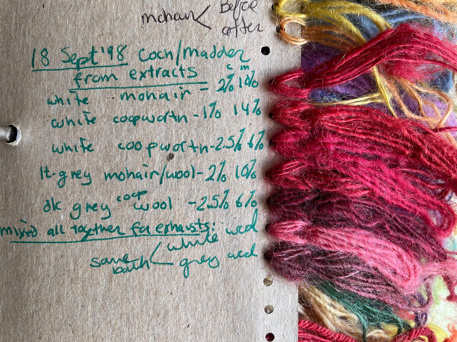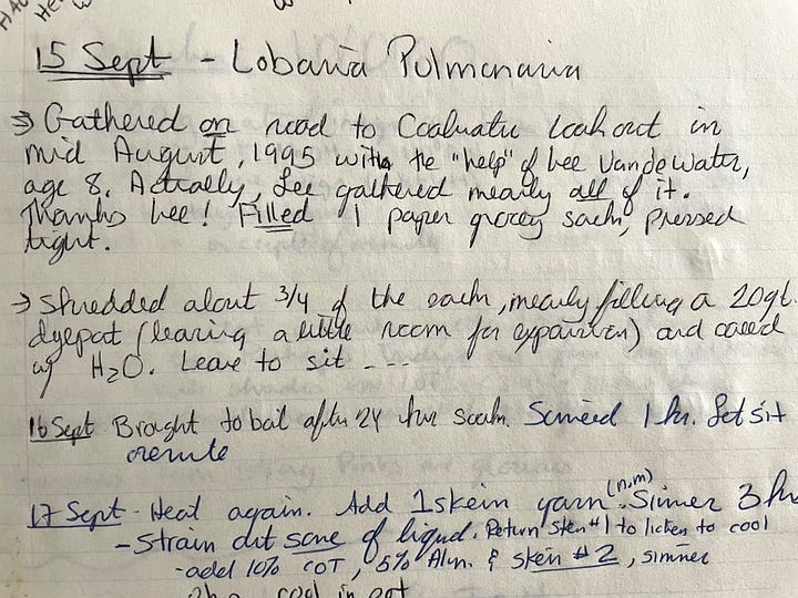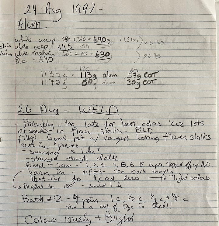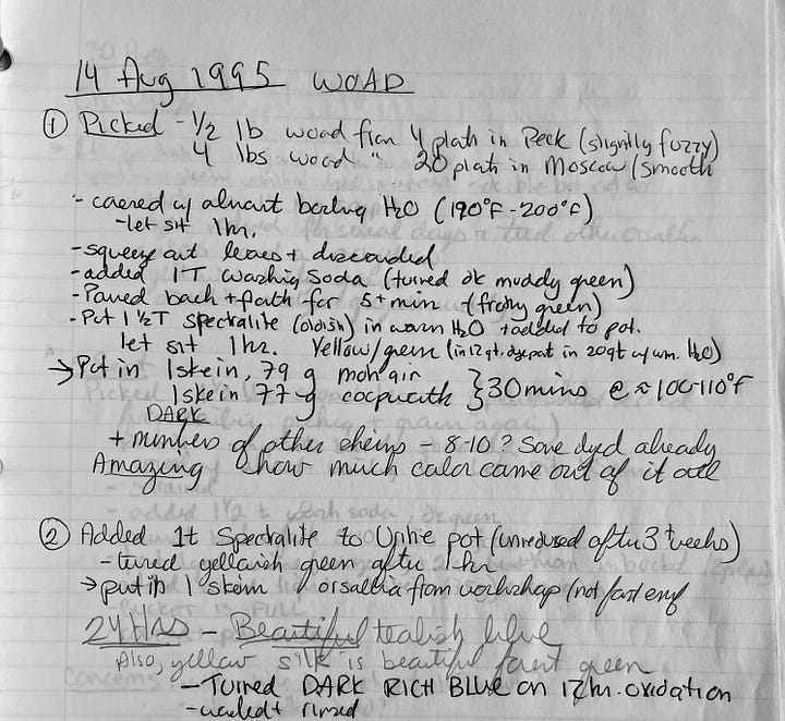 —the plant-centric play coalesced into commitment, and I gave myself over to formulas, notes, precise procedures, and the five most light-fast dyes I could access: indigo, cochineal, madder, weld, and black walnut. 4