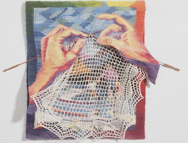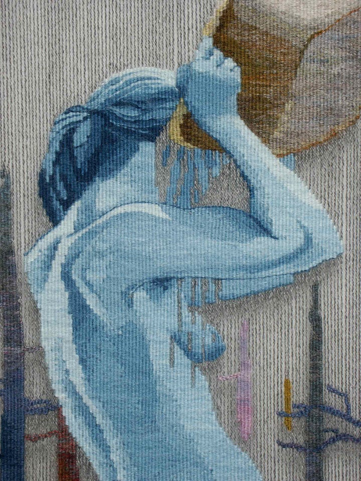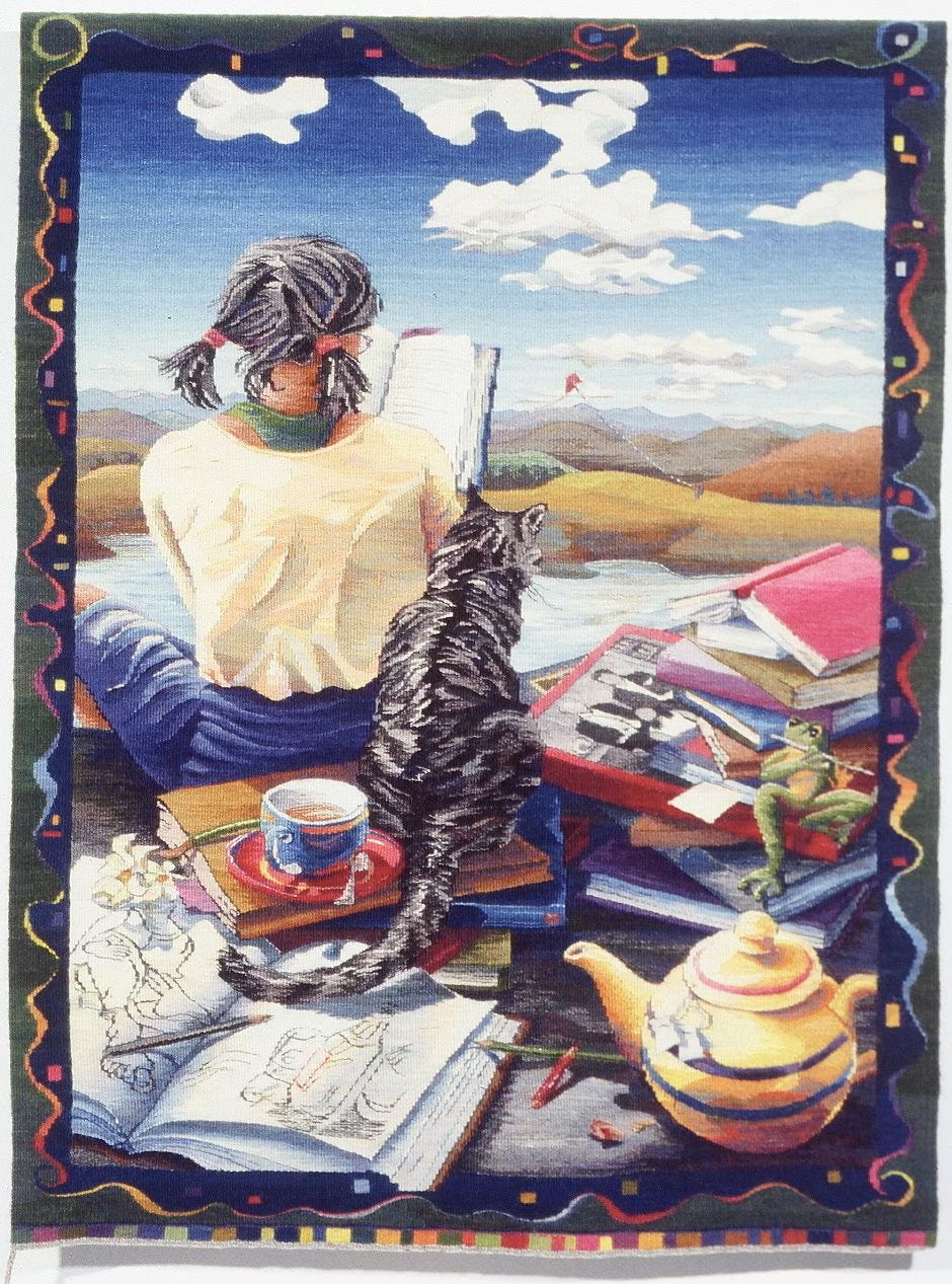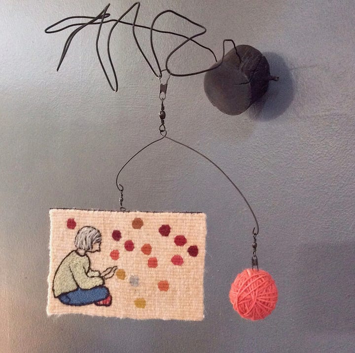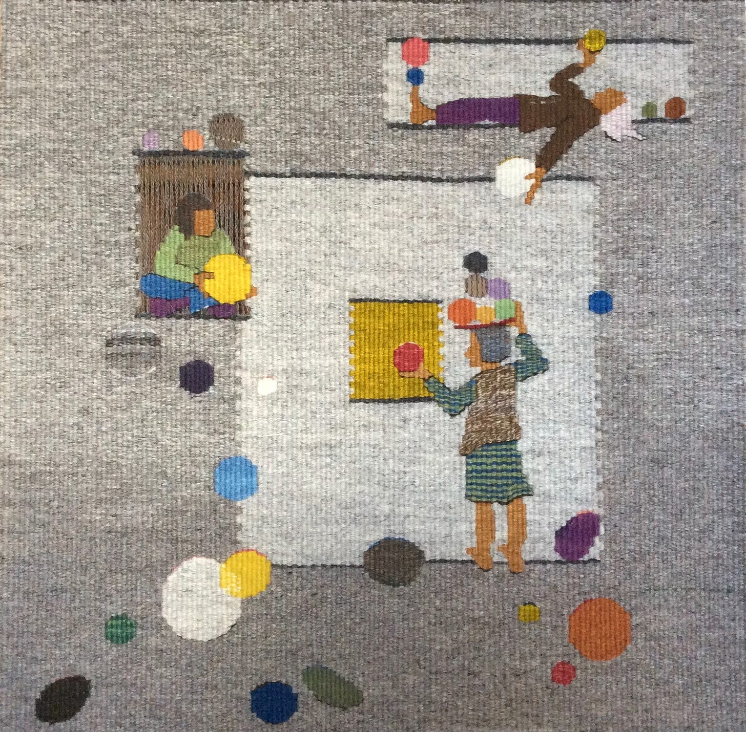 Already working with and committed to Lanaset (synthetic acid dyes), into which I’d invested massive effort and $$ , the shift was sparked by a single tapestry guided by two new parameters: 1. I’d weave in all the ends as I went, and 2. I’d use only natural dyes for the yarn. I’ve done both ever since.