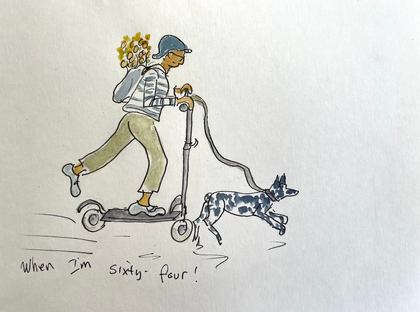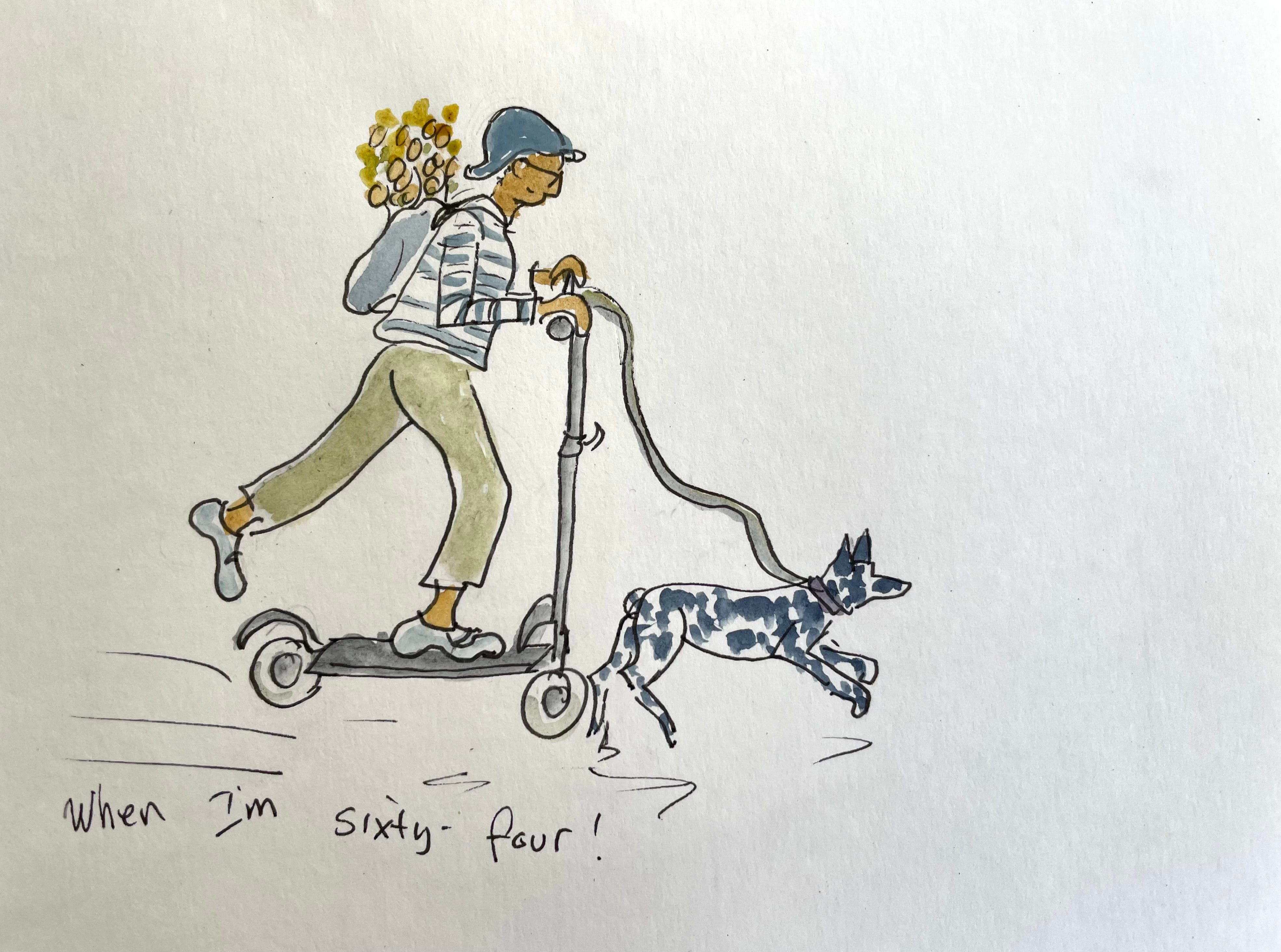 I won this razor scooter in a raffle at the Veterinarian’s office and used it to scoot to and from school with my son and our two dogs. I adored swooping around town, especially downhill, and I fear I got a teensy bit reckless (after all it was the turn of the century and I was only in my early forties). Until one day I zipped into my driveway, hit a bigger-than-usual pebble and did a face plant right in front of our house. And that, as they say, was that. Until now. Because somehow this cute little scooter made the cut in the great basement-emptying project that preceded moving house—and off I go again, dog and all.