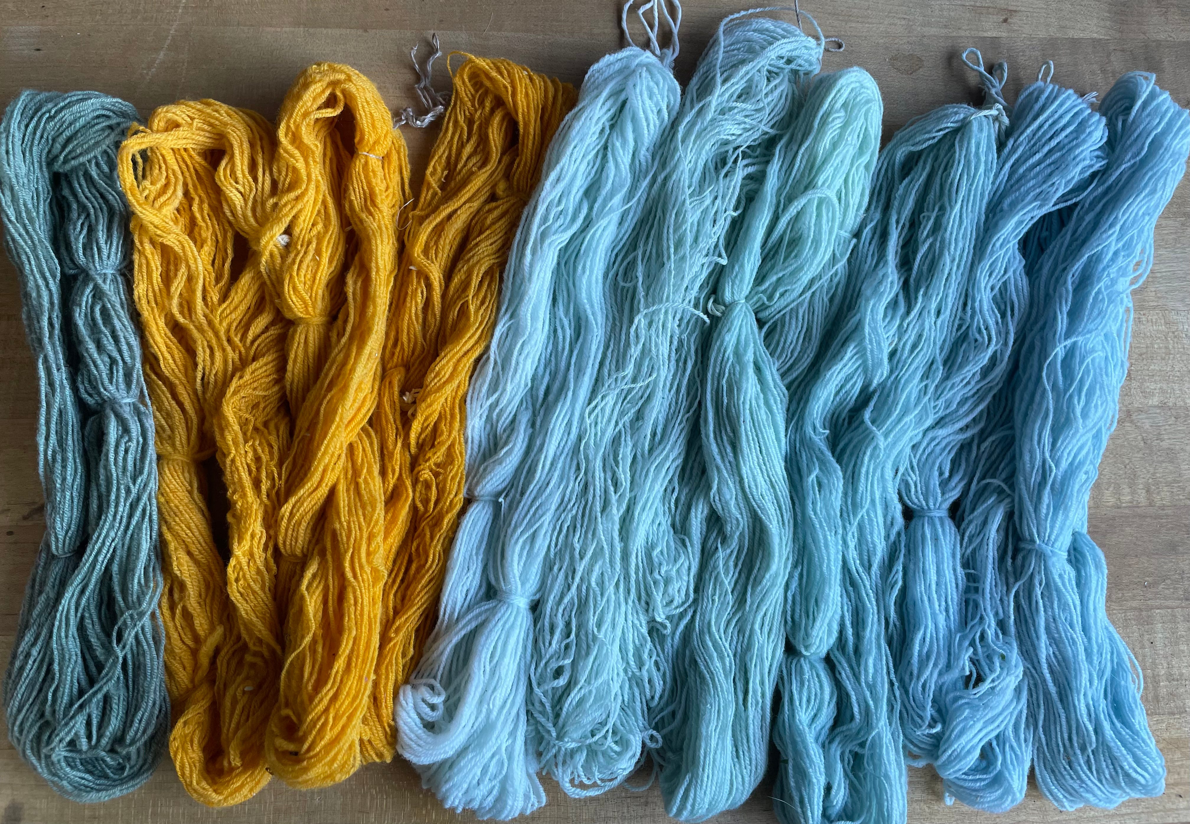 The synthetic acid wool dyes are excellent, but I was overwhelmed by the number of base colors and never really felt comfortable with the breadth of choice. This red, or that? Or maybe that other. And how many blues are there to choose between? And yellows? Oh dear. Indeed all else aside, I cannot describe the relief of committing to a seriously limited palette. It has freed me in so many ways. There are still endless possibilities since I’m a spinner and the fleece of one breed of sheep will take dye differently than the fleece of another. There are also a million shades of natural grey and brown to overdye so I’ve never felt even remotely hampered. And almost no matter what, the colors will work together.